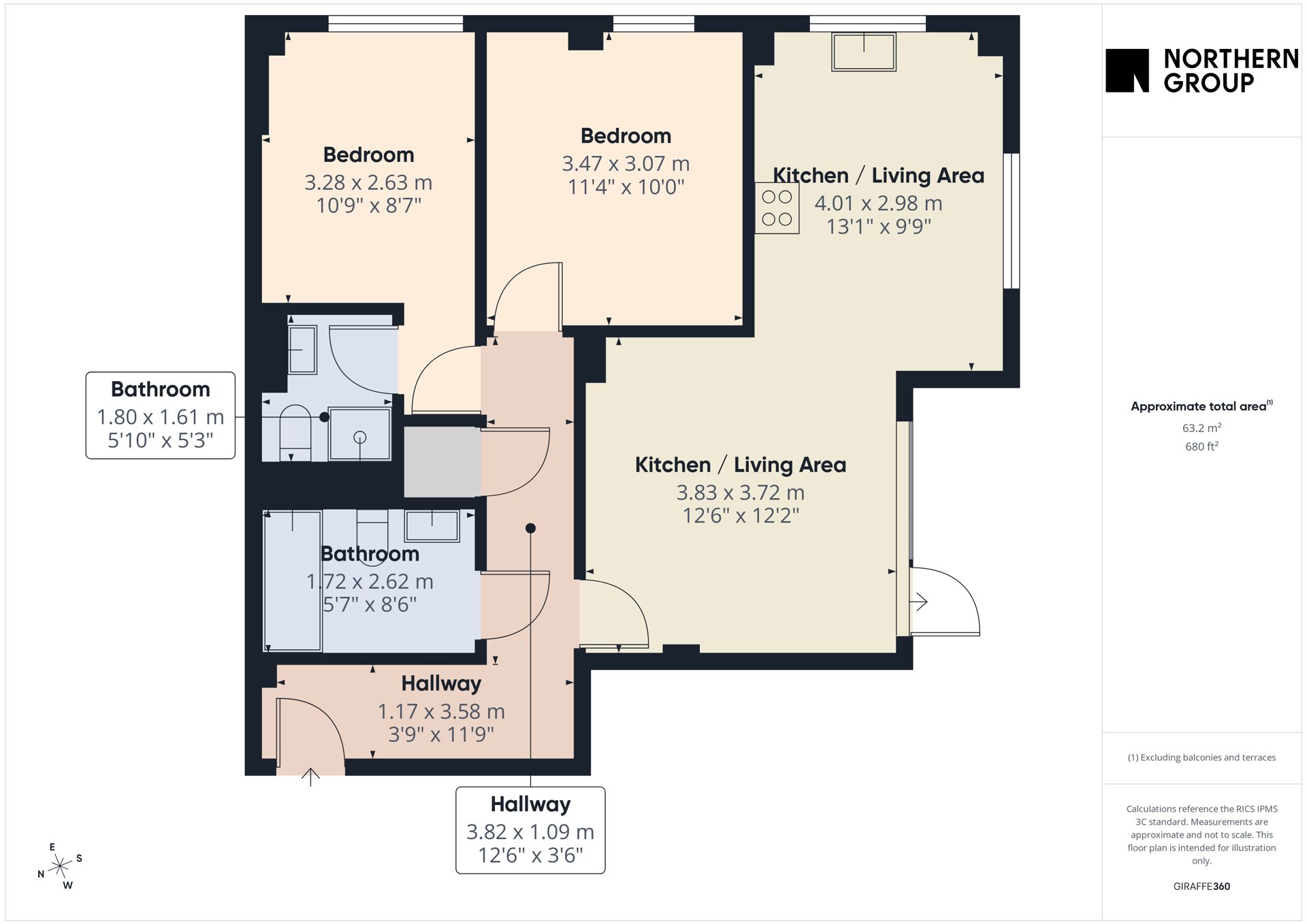 The apartment comprises a spacious entrance hallway, two double bedrooms including an en-suite to the primary bedroom, a modern main bathroom with shower over the bath, and an open-plan living and kitchen area with integrated appliances. The property also benefits from a private balcony and offers approximately 680 sq ft of internal space.