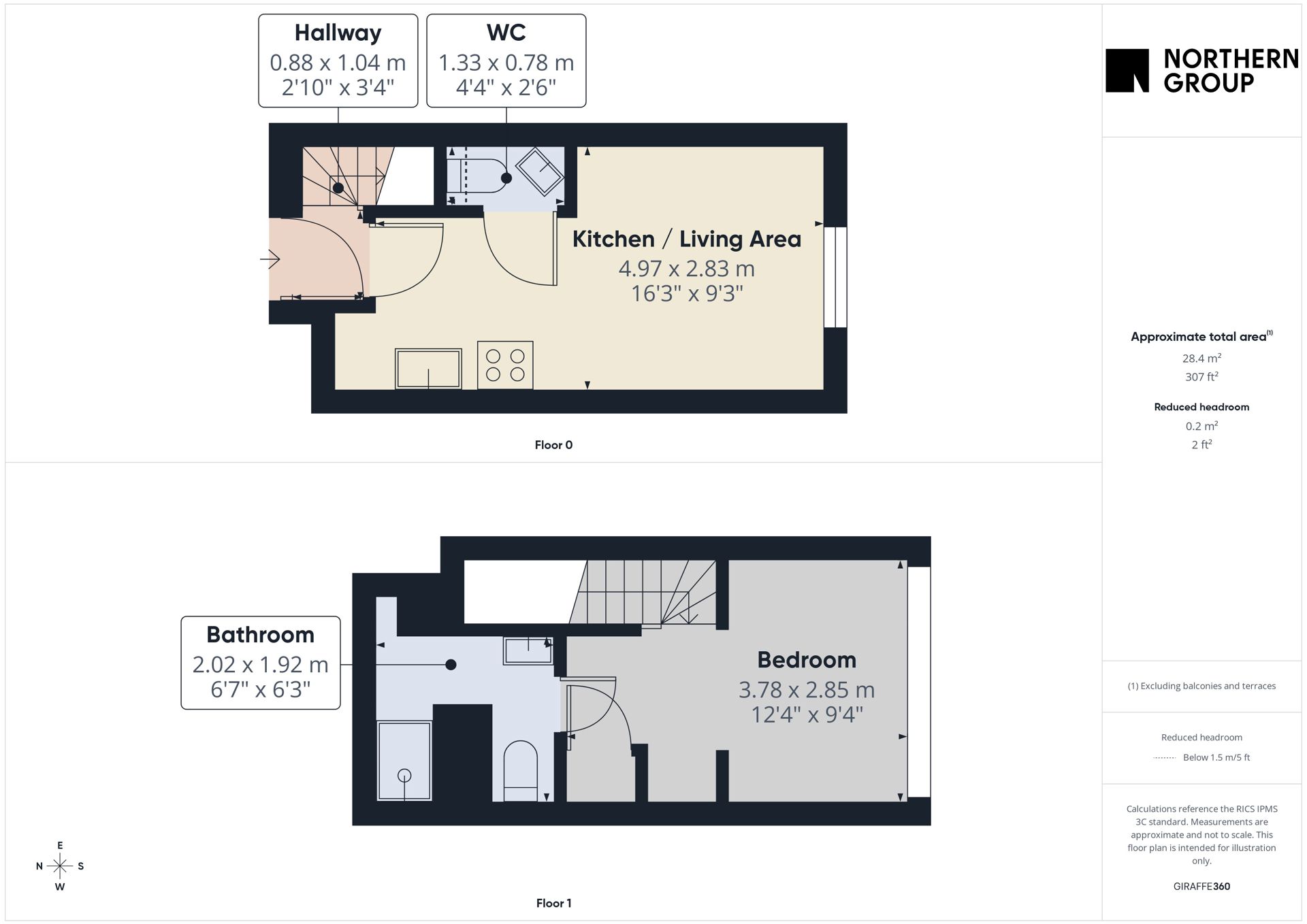 The apartment comprises a bright open-plan living and kitchen area, spacious double bedroom with en-suite bathroom, and an additional downstairs WC. The duplex layout provides a practical separation of living and sleeping space.